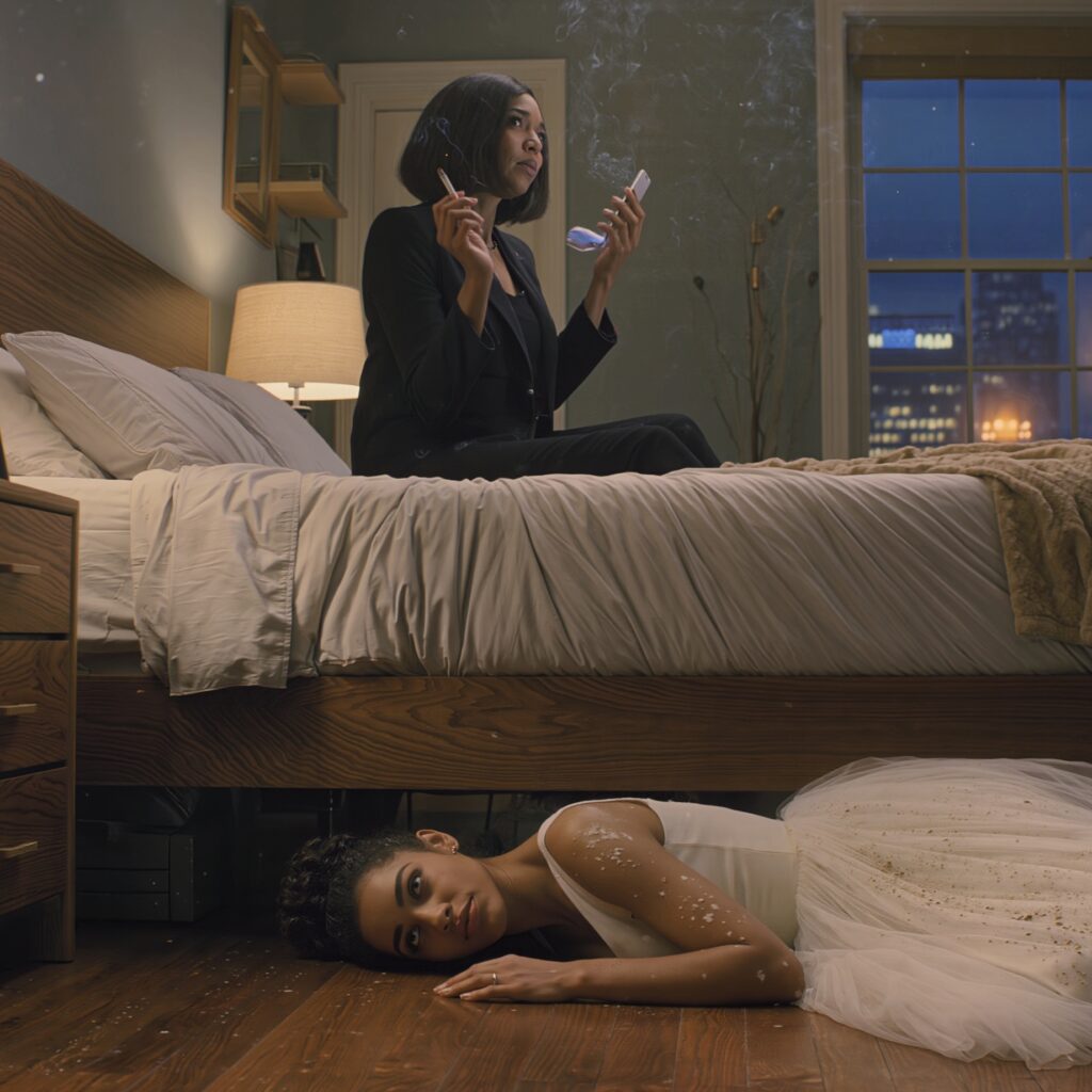 Abini held her breath, pressed flat against the cool hardwood floor beneath the enormous mahogany bed, barely stifling a laugh. The white wedding dress, which she still hadn’t changed out of since the ceremony, billowed around her like a cloud, the veil tangled in the box springs above her head.