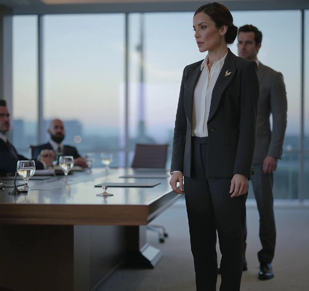 She wore black, not out of mourning, but of power. A tailored suit, heels that made her taller than most of the men in the room, and an expression carved from silence. Not anger, not pride—just stillness. The kind that makes people nervous.
