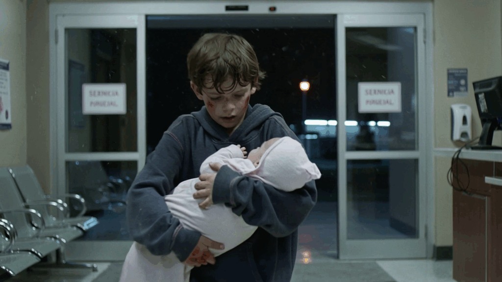 It was just past midnight when Ethan Walker, a bruised seven-year-old boy, stumbled into the emergency room of St. Mary’s Hospital in Indiana, carrying his baby sister wrapped in a thin pink blanket. The automatic doors slid open with a soft hiss, letting in the freezing winter air—and a silence that made every nurse look up. A night nurse named Caroline Reyes was the first to notice. Her eyes widened as she saw the small boy, barefoot, his lips trembling from the cold. He clutched the baby so tightly it looked like he was holding on for life itself.