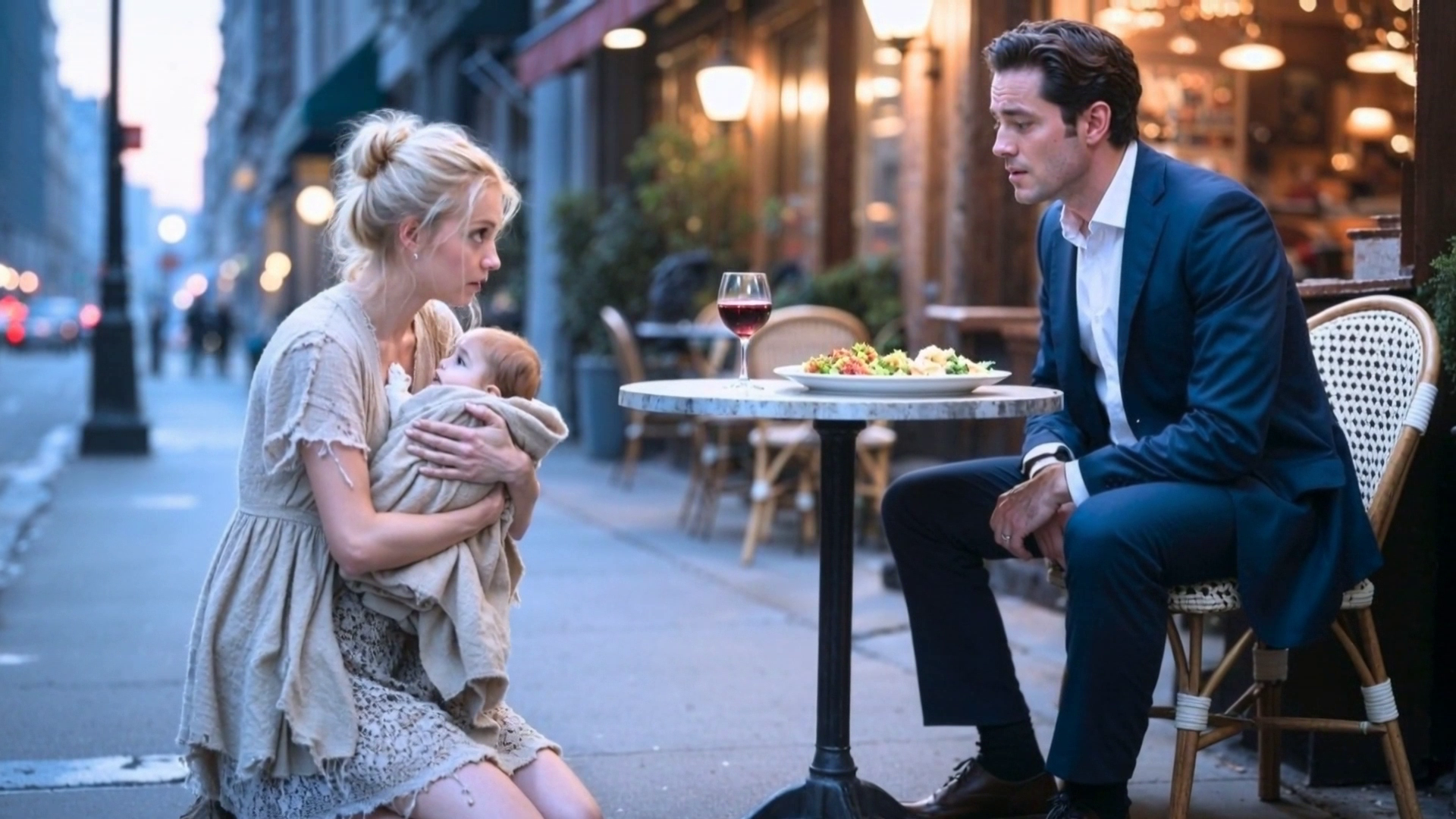 He noticed her when the crowd eddied and a gap opened in the flow. A young woman—twenty-five at most—approached the patio with the careful gravity of someone carrying something irreplaceable. A baby slept against her chest, wrapped in a knitted blanket the color of oatmeal. Her ponytail was practical; her clothes were clean but tired at the edges. She paused at the host’s stand as if gathering nerve, then turned her face toward the diners.