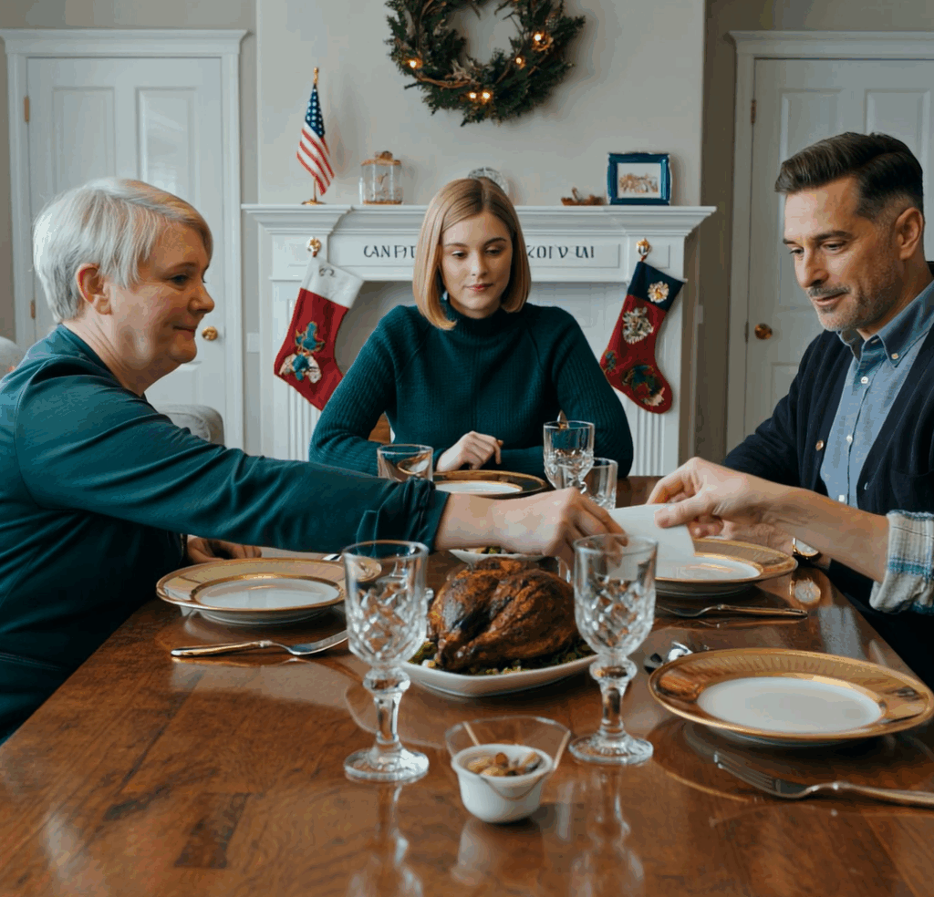 Grandpa’s house looked exactly the same as it had a week earlier—warm light spilling from the windows, wreaths on every door, a quiet hum of a fireplace inside. The air was the color of mulled wine and cedar, everything hushed and intentional. When I stepped into the dining room, the table was set the same way—three place settings, same gold‑rimmed plates, the same silver serving tray polished to a mirror. Except this time, the space between us felt heavier.