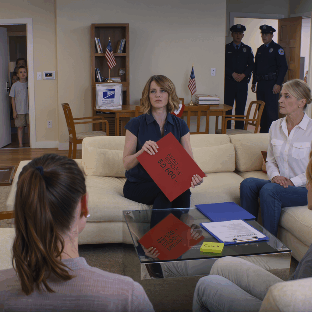When the knock comes, the apartment falls silent. Two officers stand in the doorway—a woman with cropped blonde hair and a man with serious eyes.
